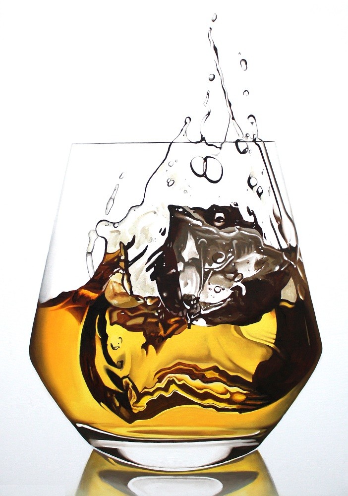 In the center of the painting, there is a full glass of golden whisky in a transparent crystal glass. A single ice cube has just been dropped into the glass, creating a spectacular effect of splashes and sprays. The amber liquid is in motion, about to completely surround the ice cube, and small splashes of water and whisky rise into the air.